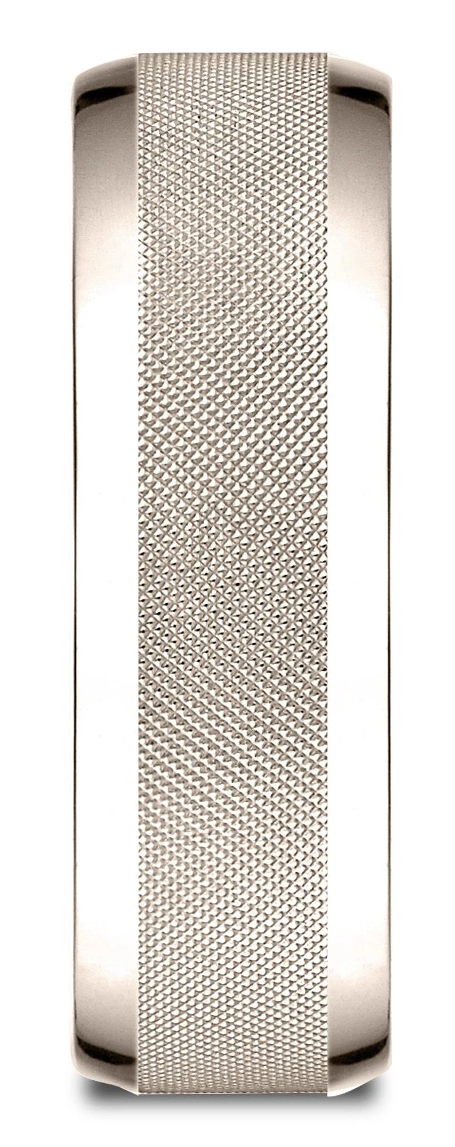This Refined 14 Karat Rose Gold 7mm Comfort-fit Carved Design Band Features An Intricate Cross Hatch Pattern Center Framed By High Polish Round Edges.