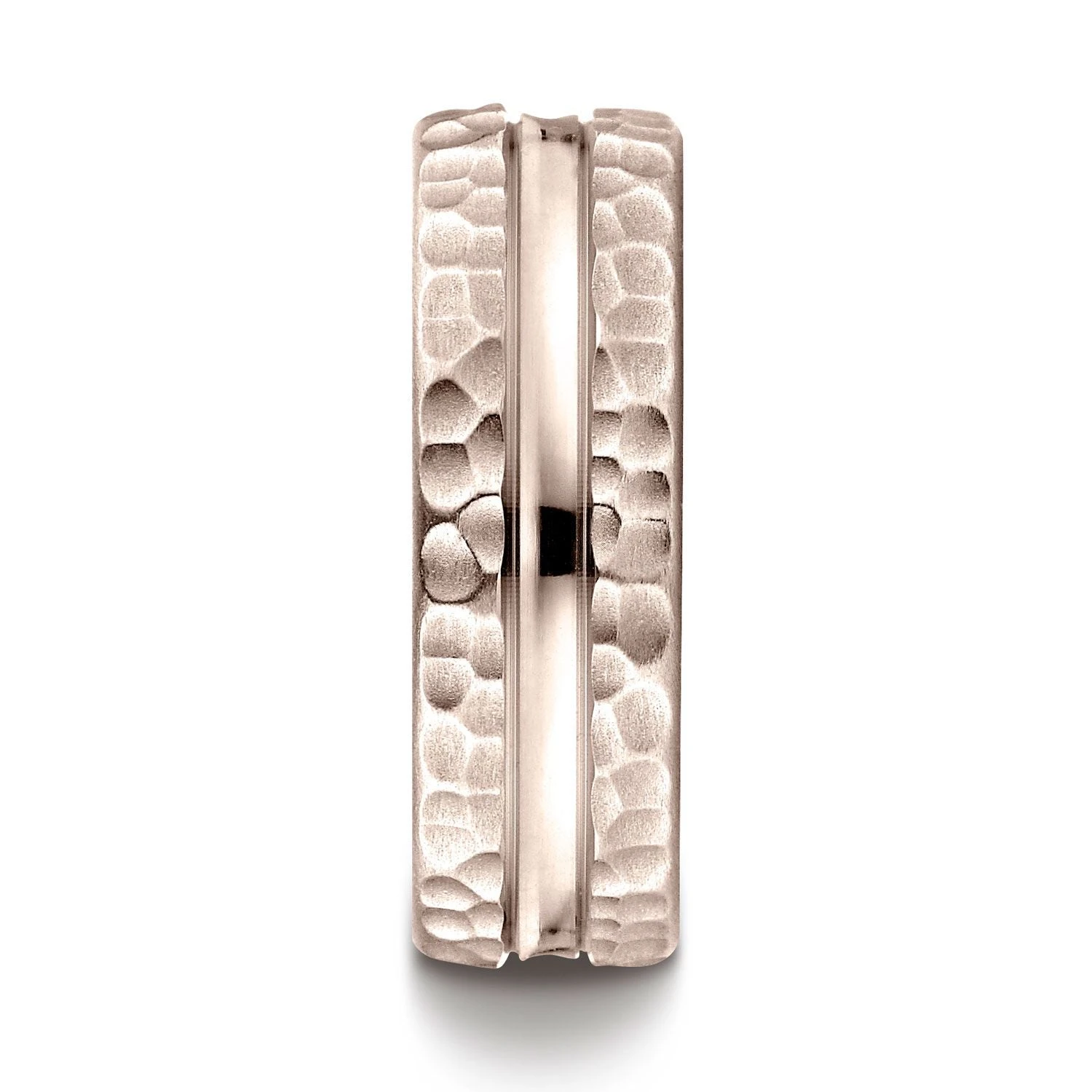 This 14 Karat Rose 7.5 Mm Band Features A High Polish Center Cut With A Hammered Finish That Exemplifies Modern Sophistication