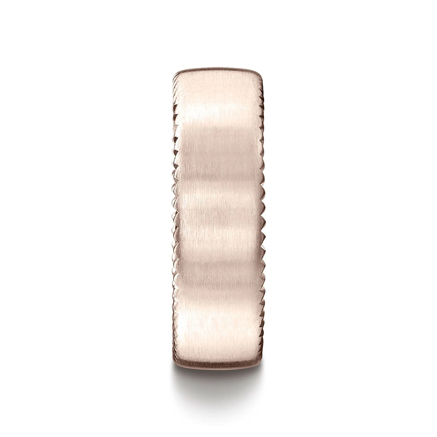 This Unique 14 Karat Rose 7.5mm Comfort-fit Satin-finished Carved Design Band Features An Elegant Rivet Coin Edging For Unforgettable Style.
