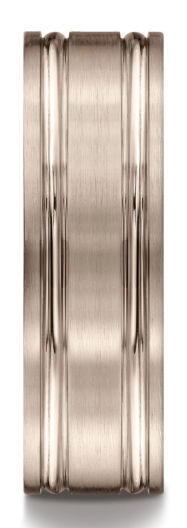 This Incredible 14 Karat Rose 7mm Comfort-fit Satin-finished Carved Design Band Features Two High Polished Parallel Center Grooves For A Continuous Flow Of Style.
