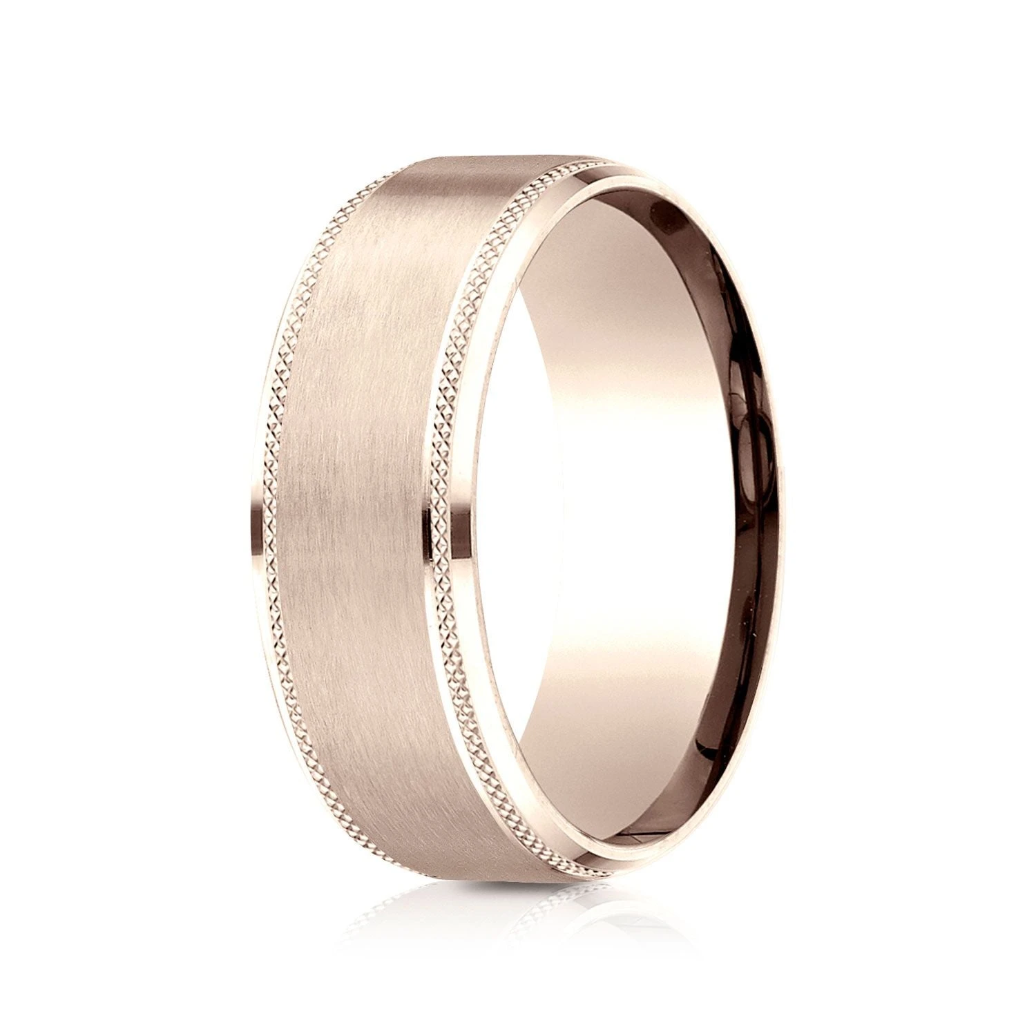 Beautifully Modern, This 14 Karat Rose Gold 8mm Comfort Fit Design Band Features A Unique Knurled Edge Drop Bevel And A Satin Finish Center