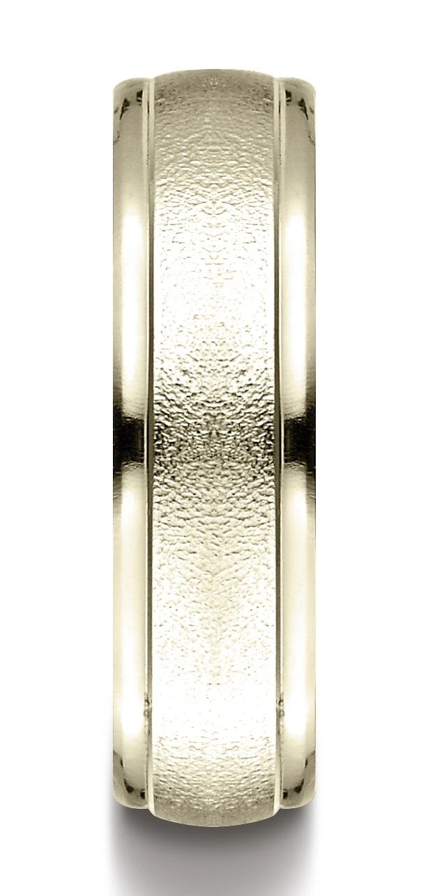 This 14 Karat Yellow 6mm Comfort-fit Carved Design Band Features A Wired-finished With A High Polished Round Edge For Noticeable Style.