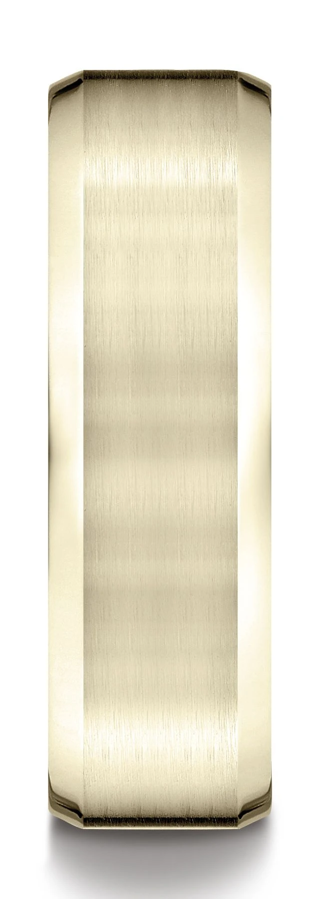 This 14 Karat Yellow 7mm Comfort-fit Satin-finished Carved Design Band Features A High Polished Beveled Edge For A Perfect Balance Of Style And Class.