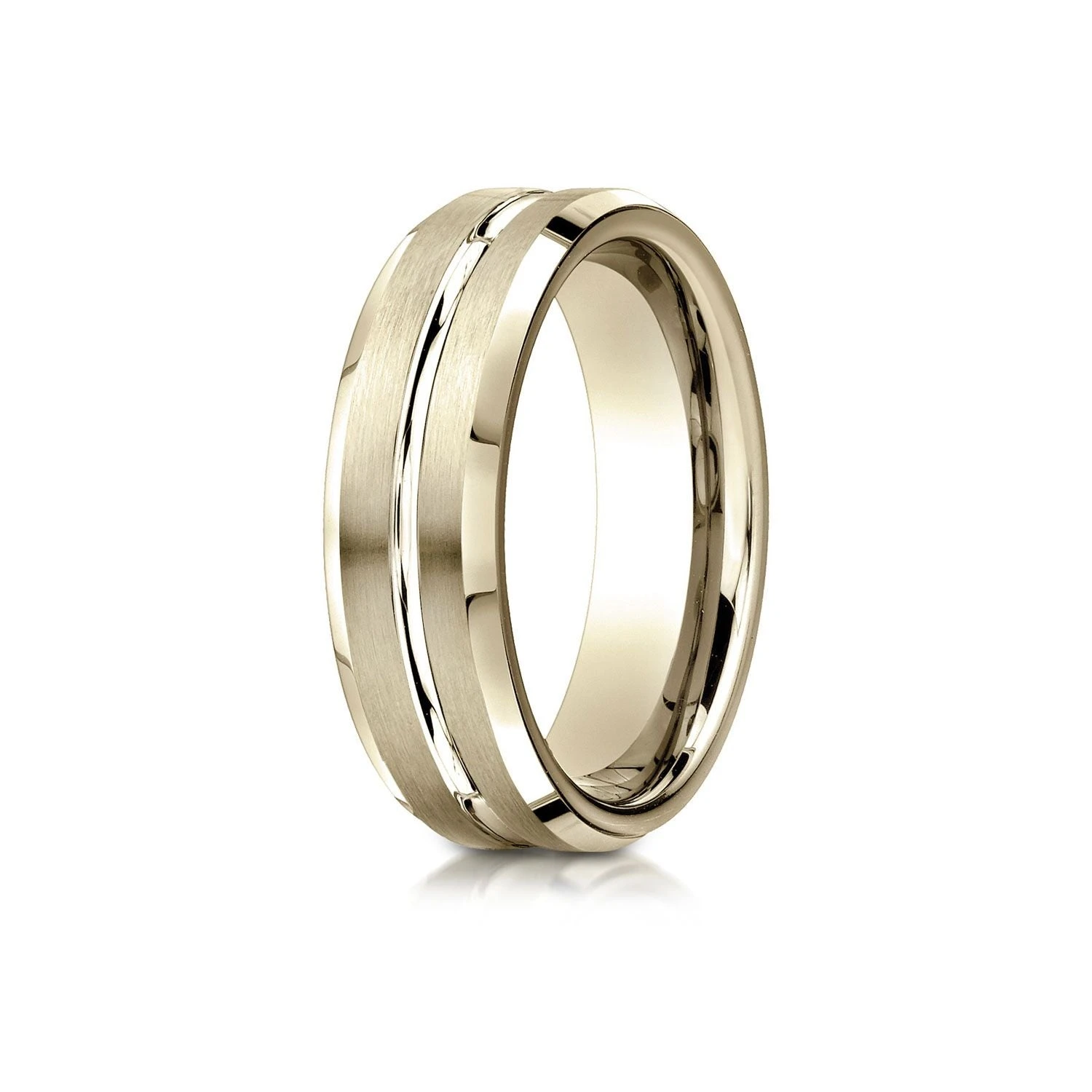 This 18 Karat Yellow 6mm Comfort-fit Satin-finished Carved Design Band Features A High Polished Center Cut And Beveled Edges For Remarkable Style.