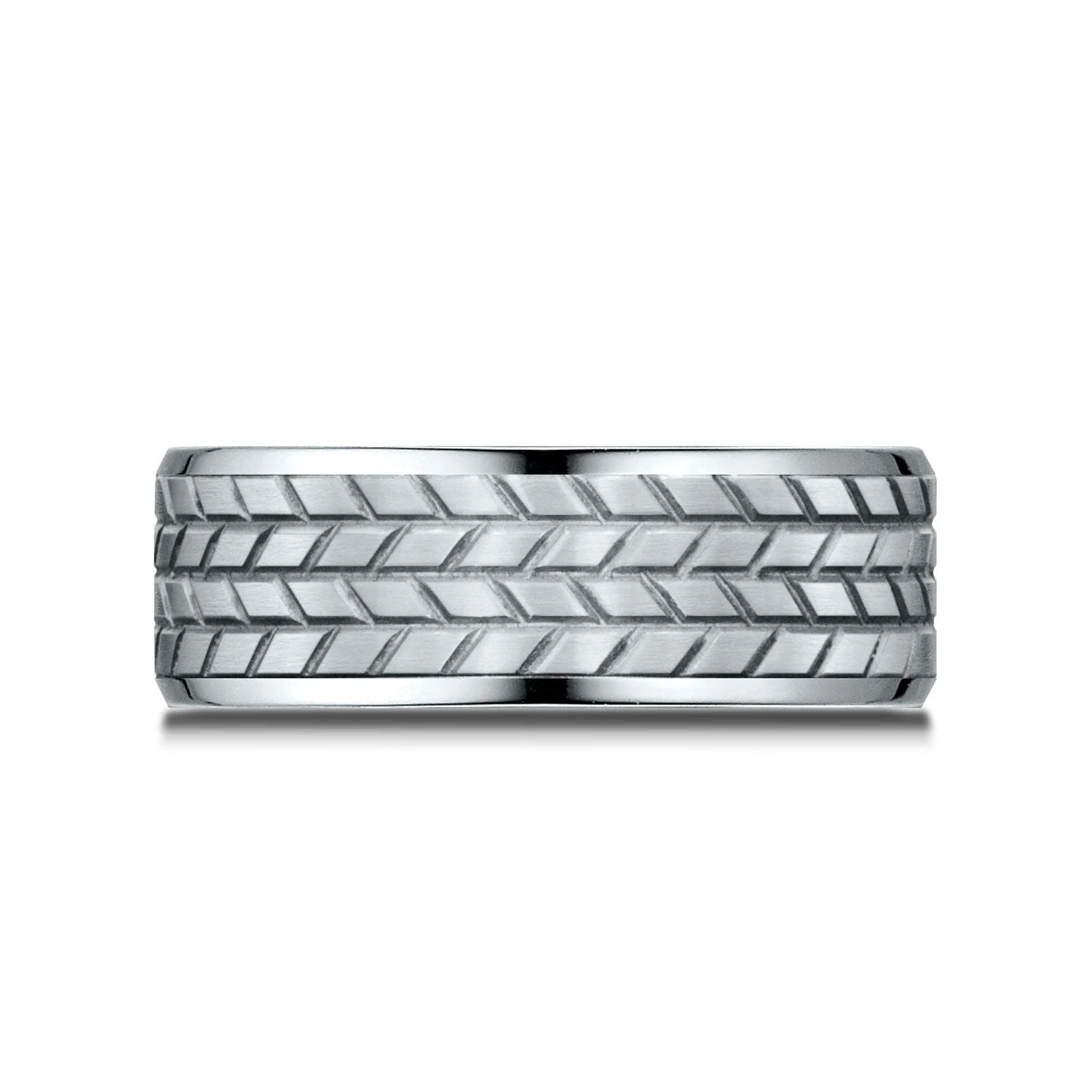 A Sophisticated Wink At Your Love For High Performance Machinery, This Platinum 8mm Comfort Fit Band Features A Treaded Pattern Beautifully Complemented By High Polish Beveled Edges