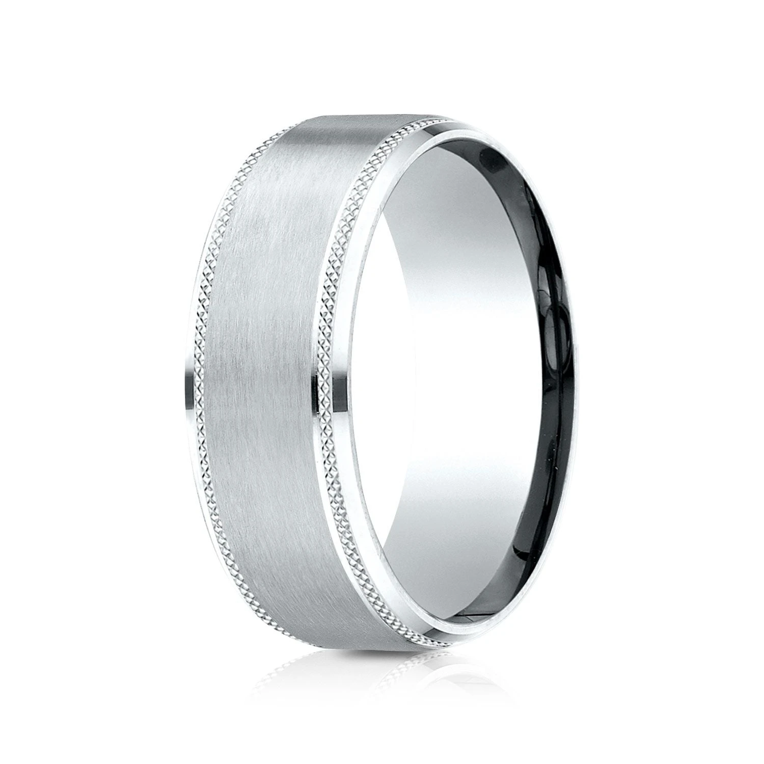 Beautifully Modern, This Platinum 8mm Comfort Fit Design Band Features A Unique Knurled Edge Drop Bevel And A Satin Finish Center