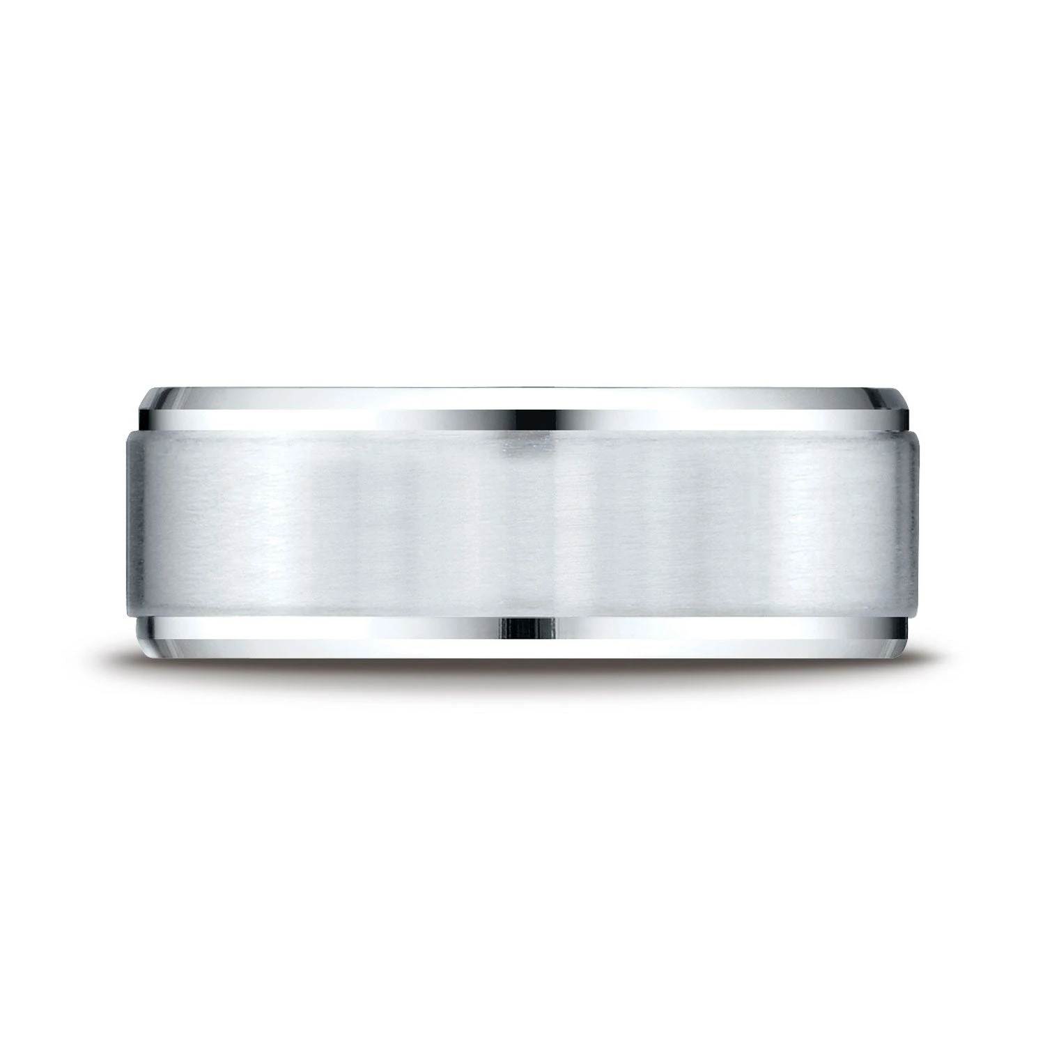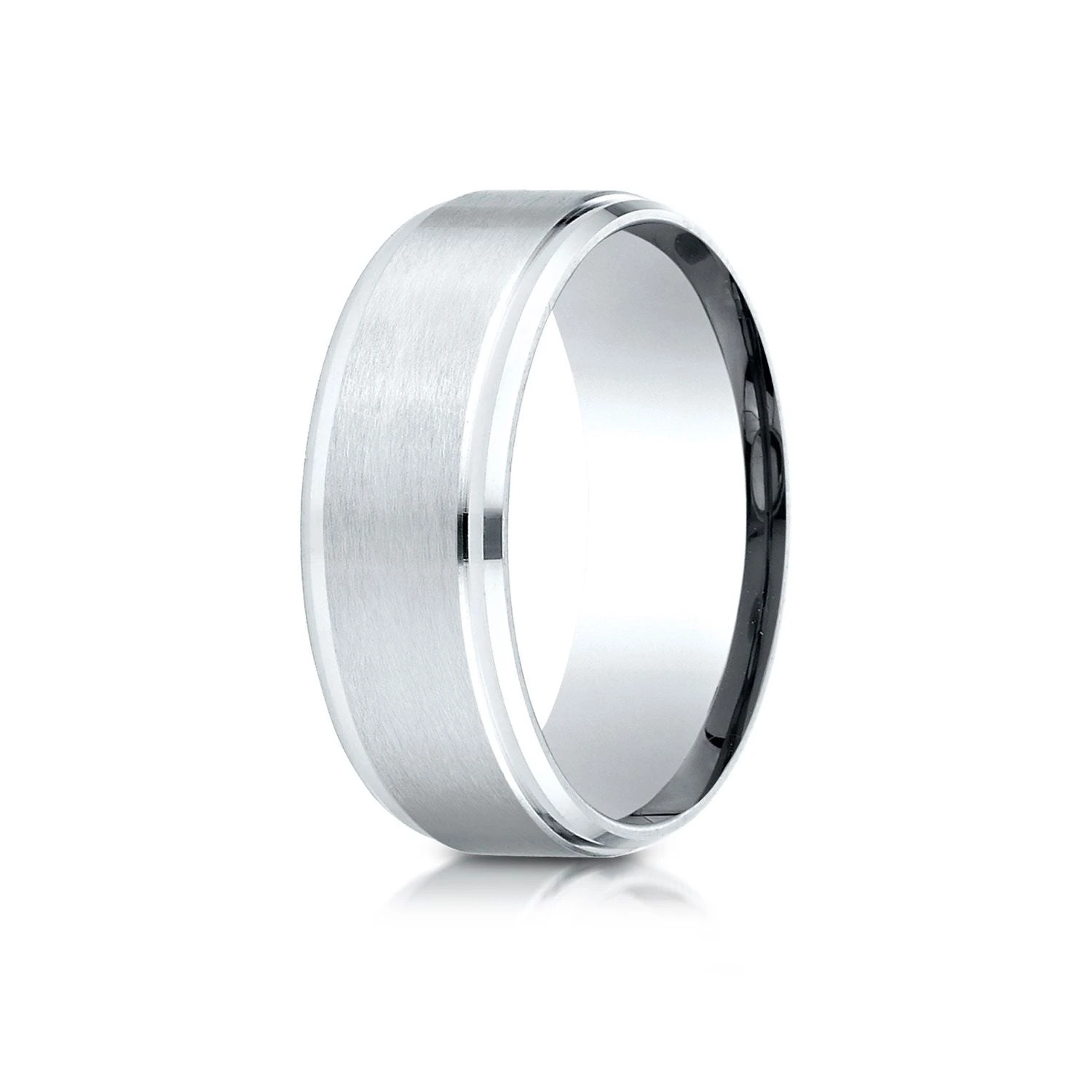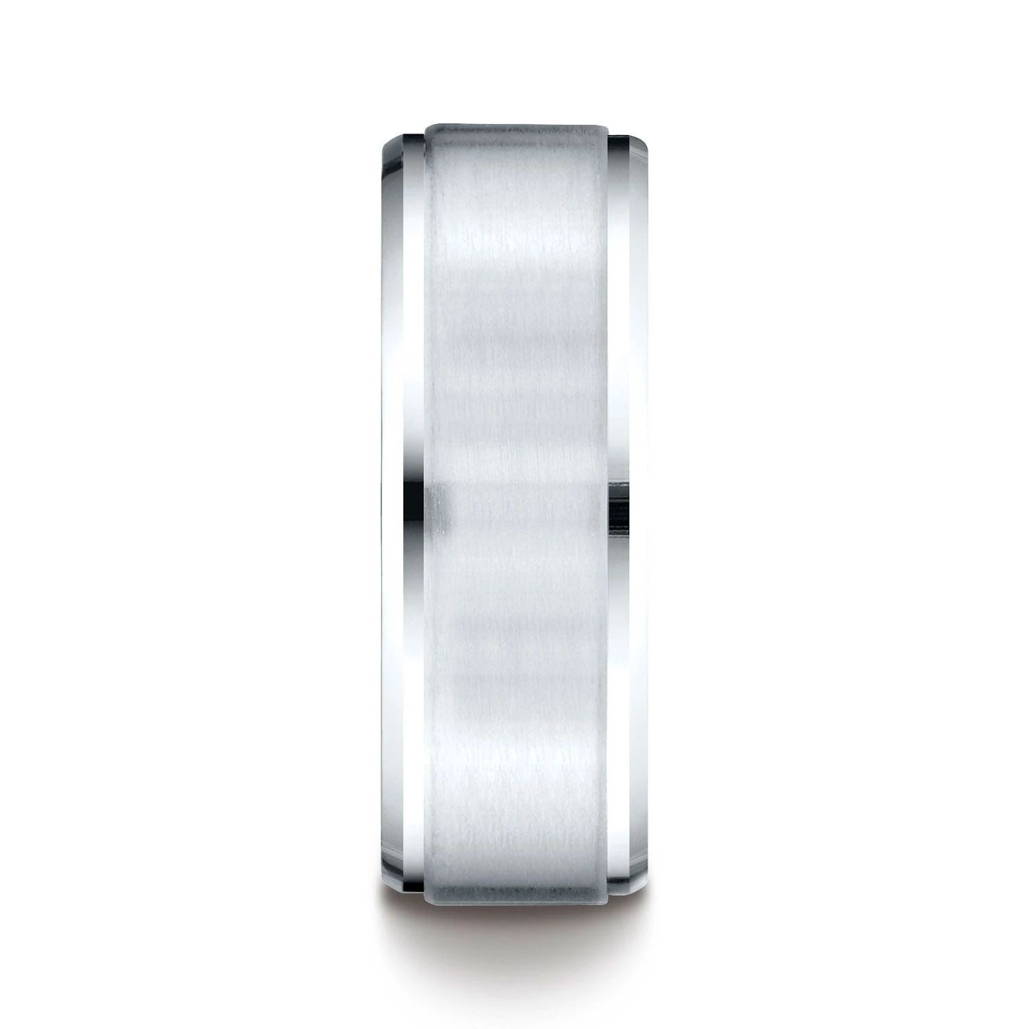 This Classically Stylish Platinum 8mm Comfort-fit Satin-finished Carved Design Band Features A Drop Beveled Edge